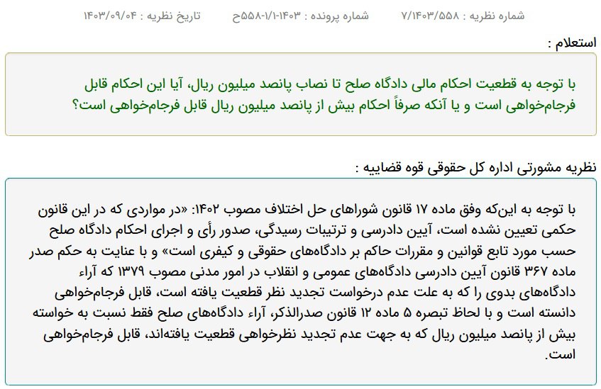 ۲. نظریه اداره کل حقوقی قوه قضائیه (شماره ۷/۱۴۰۳/۵۵۸ مورخ ۱۴۰۳/۹/۴)